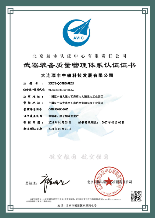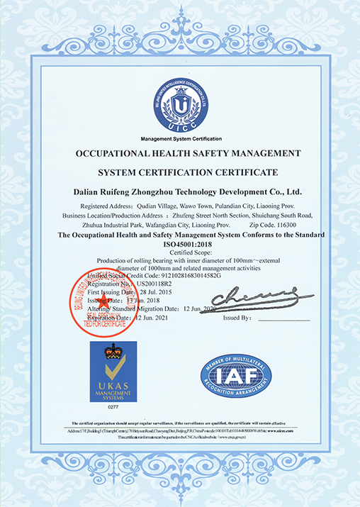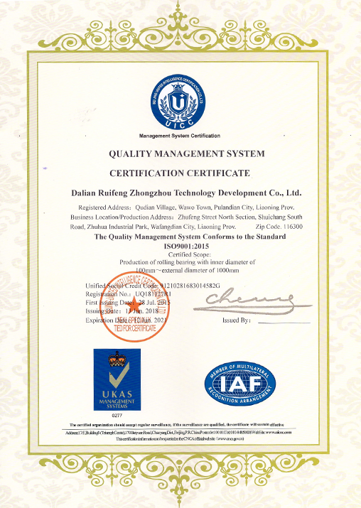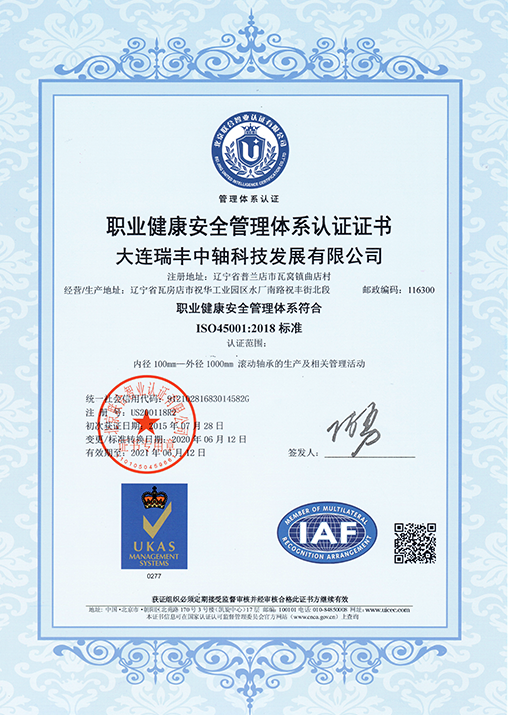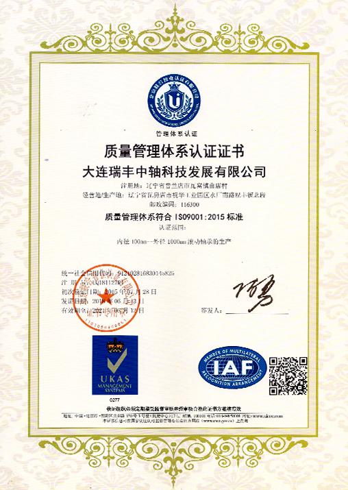 大連瑞豐中軸科技發(fā)展有限公司已通過IS09001質(zhì)量體系認(rèn)證,BSOHSAS 18001:2007職業(yè)健康 管理體系認(rèn)證,IS014001:2004環(huán)境管理體系認(rèn)證。